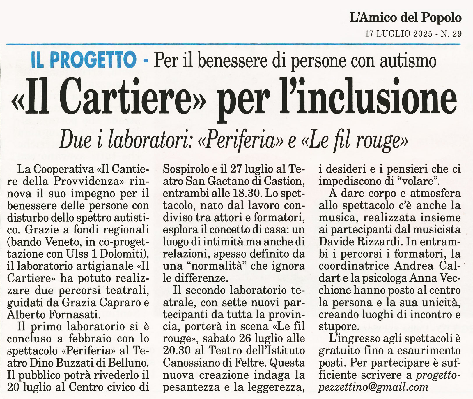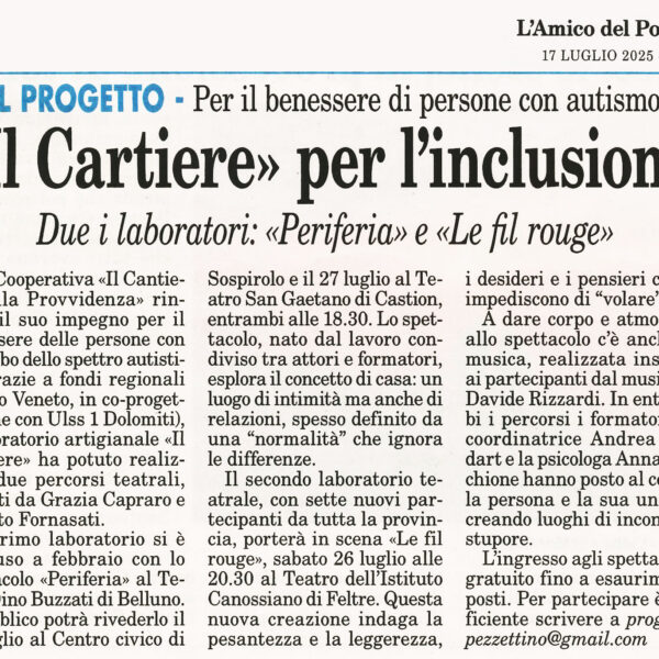 Un progetto del Cantiere della Provvidenza scs ONLUSIl Cartiere all’interno del bando della Regione del Veneto per le attività di promozione del benessere e della qualità di vita delle persone con disturbo dello spettro autistico, in co-progettazione con l’Azienda Ulss 1 Dolomiti